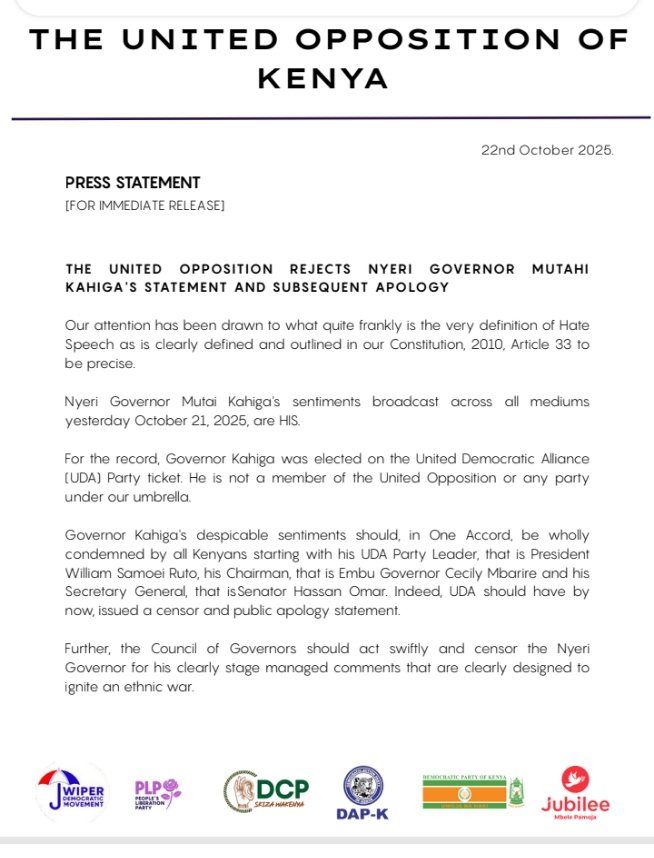 The United Opposition of Kenya has strongly condemned remarks made by Nyeri Governor Mutahi Kahiga regarding the death of former Prime Minister Raila Odinga, describing them as “the very definition of hate speech” and rejecting his subsequent apology.