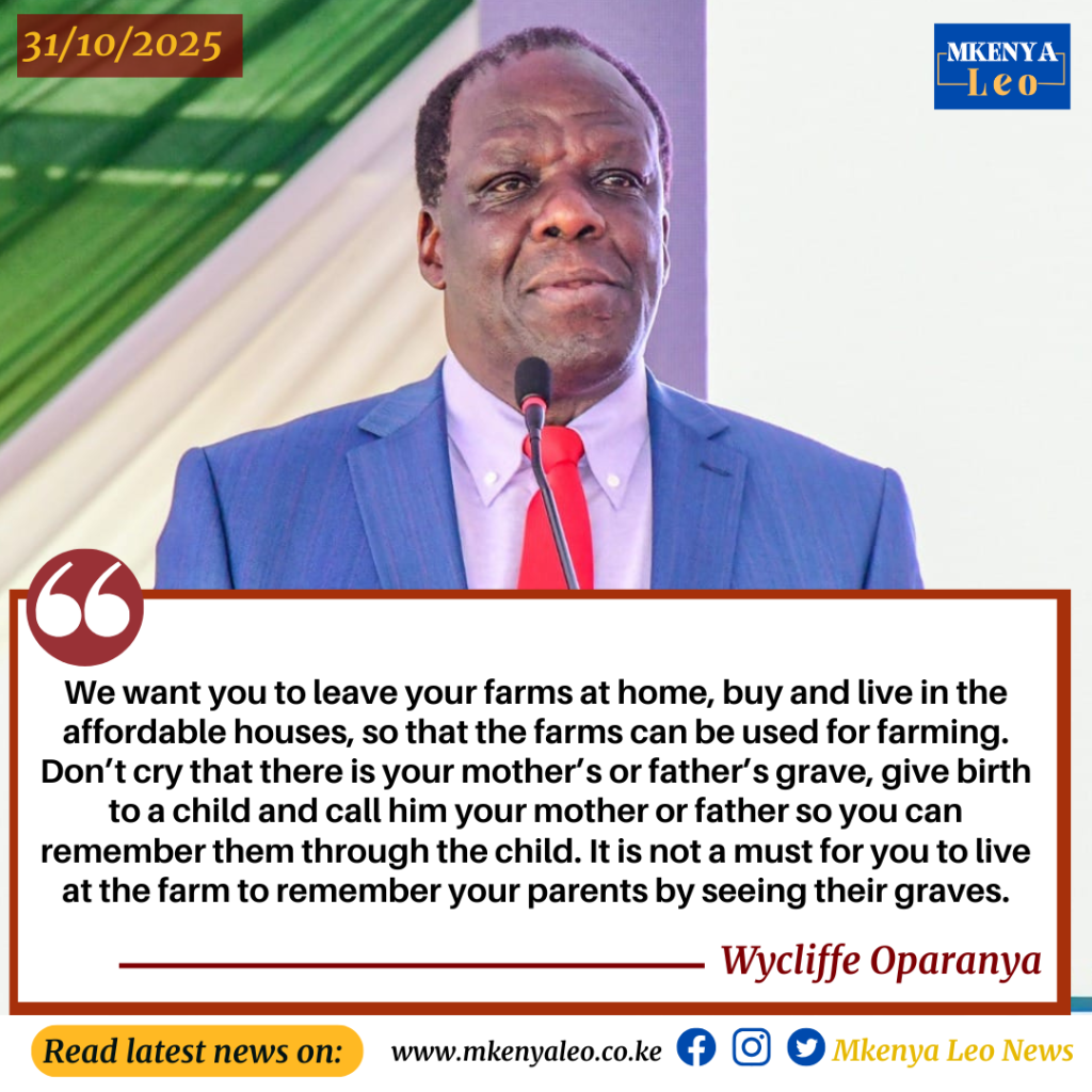 Former Kakamega Governor Wycliffe Oparanya has urged Kenyans to support the government’s affordable housing initiative by moving into urban housing units and allowing rural land to be used for farming and food production.